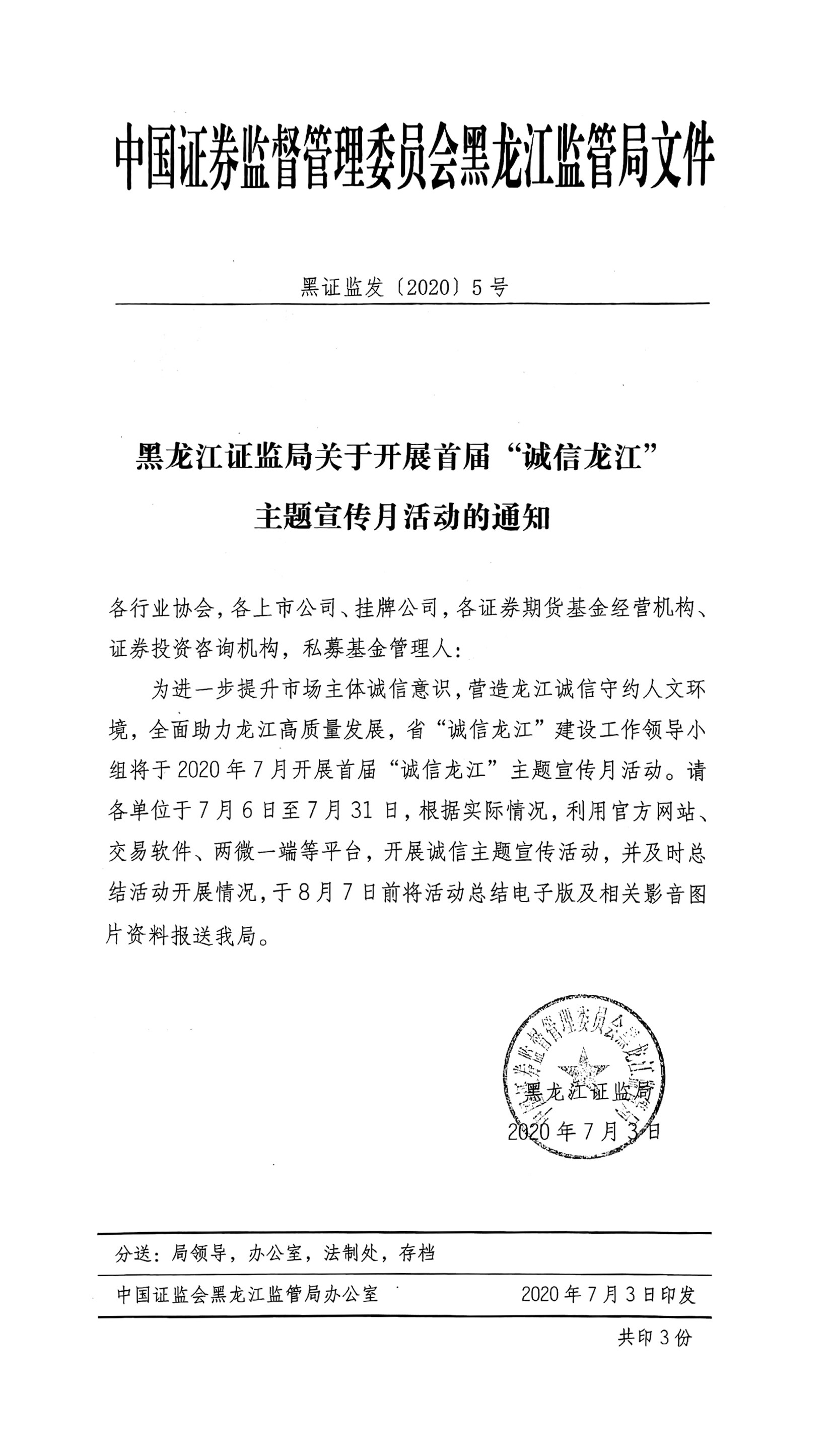 黑龙江证监局关于开展首届“诚信龙江”主题宣传月活动的通知(黑证监发[2020]5号)